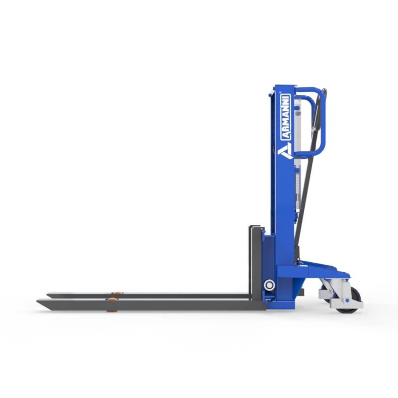 Sistema di sollevamento delle forche tramite pompa manuale rapida (salita senza carico) a leva con comando di discesa posizionato sulla stessa per favorire una rapida esecuzione; grande facilità di manovra e posizionamento del carrello grazie al sistema di specifici maniglioni laterali.