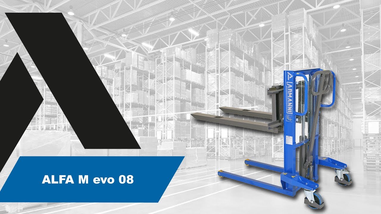 Alfa M 08 evo è un carrello elevatore a traslazione ed elevazione manuale: il sollevamento delle forche avviene tramite pompa manuale ad alzata rapida mentre la discesa è regolata dalla leva posta sul timone.