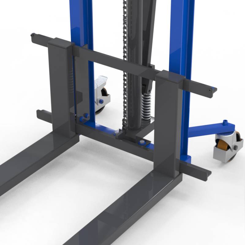 Forche regolabili manualmente sulla piastra porta forche; un semplice gesto permette di operare con lo stesso carrello movimentando carichi dagli ingombri diversi adattando così la macchina alle esigenze dell'operatore.