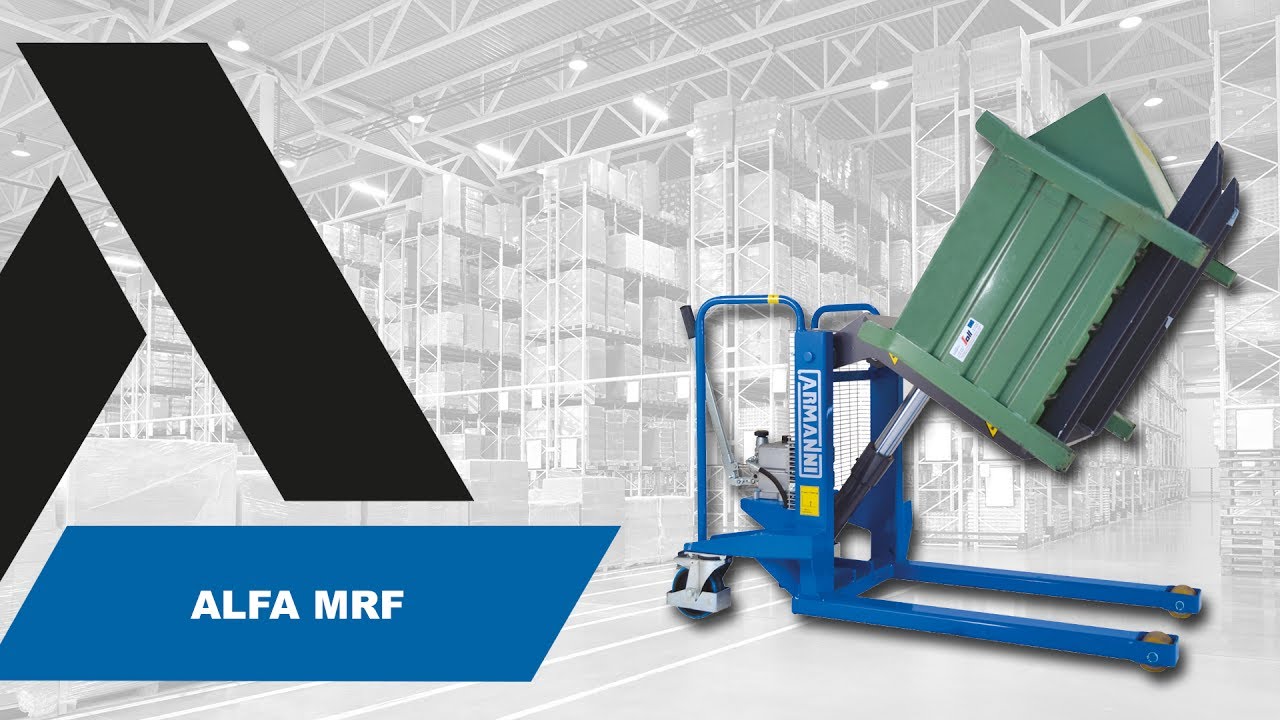 Alfa MRF è il carrello elevatore che rappresenta la soluzione specifica per le esigenze di ribaltamento e relativo svuotamento di cestoni e cassoni; consente il ribaltamento frontale del carico con un angolo massimo di 85° e una portata fino a 1000 Kg.