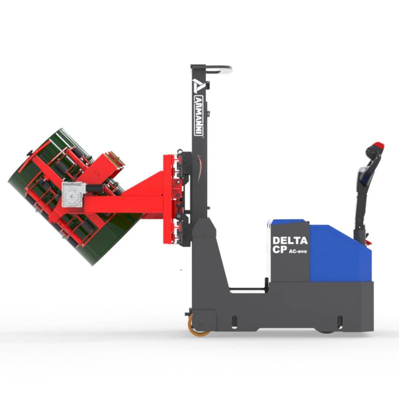Delta CP PRF-F è un carrello contrappesato dotato di pinza per la presa e rotazione frontale di fusti. Grazie alla sua configurazione senza zanche d'appoggio anteriori è in grado di avvicinarsi al fusto stoccato su pallet da qualsiasi angolazione riducendo di fatto gli ingombri e consentendo di lavorare in un'area di lavoro più ristretta. La guida a timone con servosterzo di serie garantisce all'operatore un'ergonomia e una facilità di utilizzo senza precedenti.