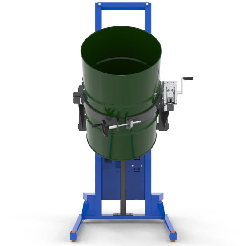La specifica attrezzatura prendi fusto, con chiusura a volantino e rotazione con riduttore manuale a vite, consente con estrema semplicità di impiegare una soluzione su misura per la movimentazione dei fusti.