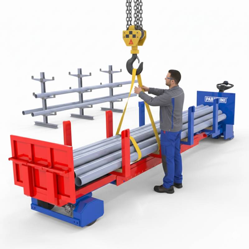 È il partner ideale per il trasporto tubi, specialmente tra una campata e l'altra, all'interno di carpenterie metalliche, trafilerie e tutte le aziende che gestiscono tubi e profili di grandi dimensioni.