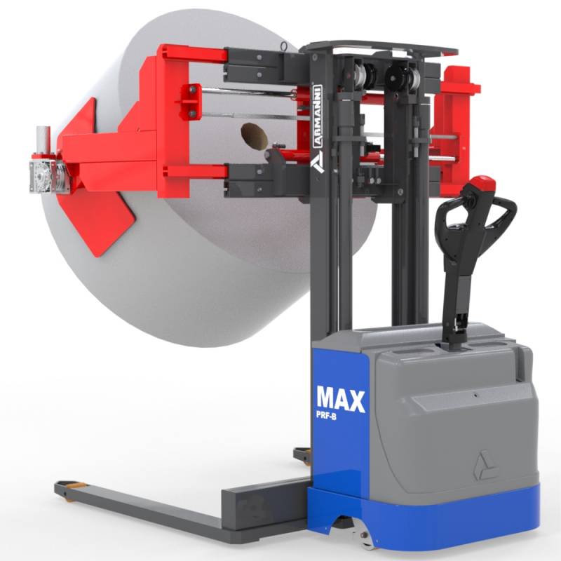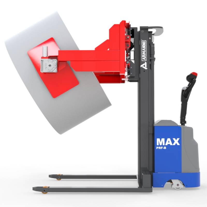 Max PRF-B ist der Gabelstapler der Armanni-Linie, der Robustheit und Kraft am besten zum Ausdruck bringt. Er wurde mit einer speziellen Struktur und aus speziellen Materialien entwickelt und hergestellt und ermöglicht das sichere Greifen und Drehen von großen Papier- und Plastikfolienrollen. In dieser Konfiguration ist Max PRF-B mit vergrößerten Klammern ausgestattet, um die Rollen direkt vom Boden aufnehmen zu können.
