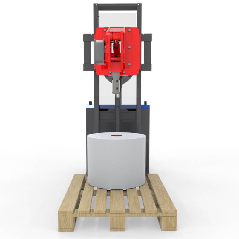 Dank seiner pneumatisch einziehenden Spindel kann er Rollen mit Hilfe von „Kernen“ anheben, wodurch eine Beschädigung des Außenmaterials der Rolle vermieden wird und das Einsetzen in die Maschine ermöglicht wird.