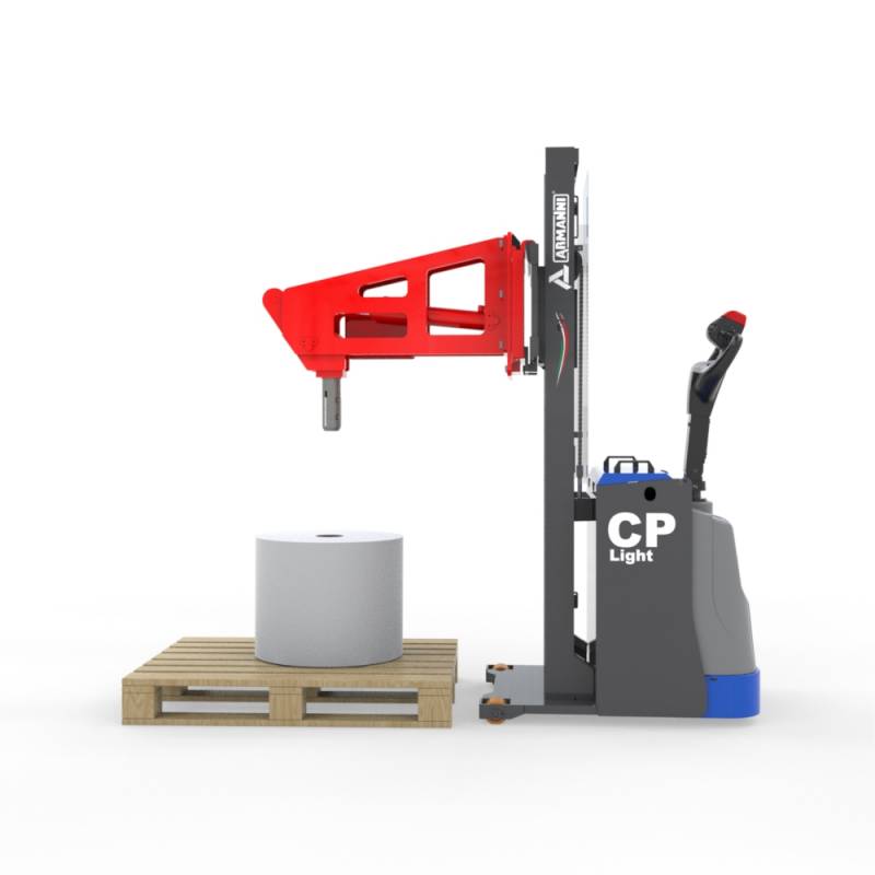 CP Light MANDREL ist ein ultrakompakter, ausbalancierter Wagen mit Manipulator für empfindliche Rollen. Er ist die ideale Lösung für diejenigen, die empfindliche Rollen durch einen internen Kern bewegen müssen. Dank der ausbalancierten Basis kann sich der CP Light - Mandrel der Rolle auf einer Palette aus jedem Winkel nähern, was eine auf dem Markt einzigartige Wendigkeit ermöglicht. Das System zum Greifen der Rolle mittels eines automatisch einfahrenden Manipulators garantiert stets ein Höchstmaß an Sicherheit, da der Griff auch bei leerer Batterie oder einem zufälligen Stromausfall erhalten bleibt. Cp Light - Mandrel ist für das Greifen und Drehen von Rollen bis zu 90° konzipiert, um das Be- und Entladen von Verpackungsmaschinen zu erleichtern.