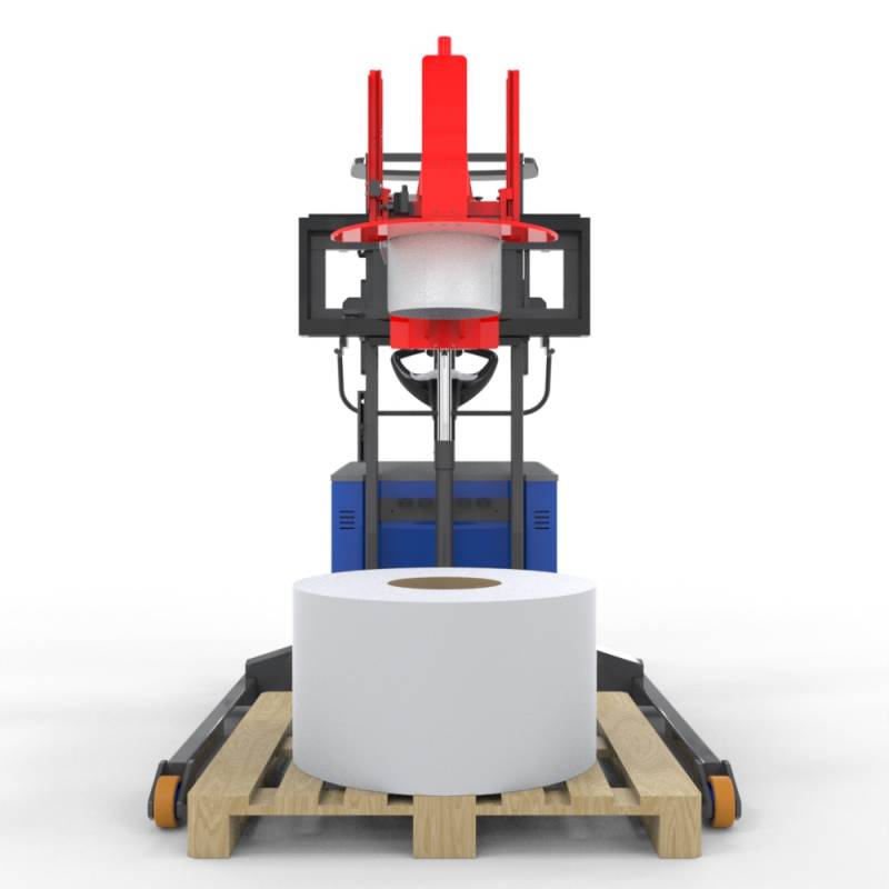 Dank seiner pneumatisch einziehenden Spindel kann er Rollen mit Hilfe von „Kernen“ anheben, wodurch eine Beschädigung des Außenmaterials der Rolle vermieden wird und das Einsetzen in die Maschine ermöglicht wird.