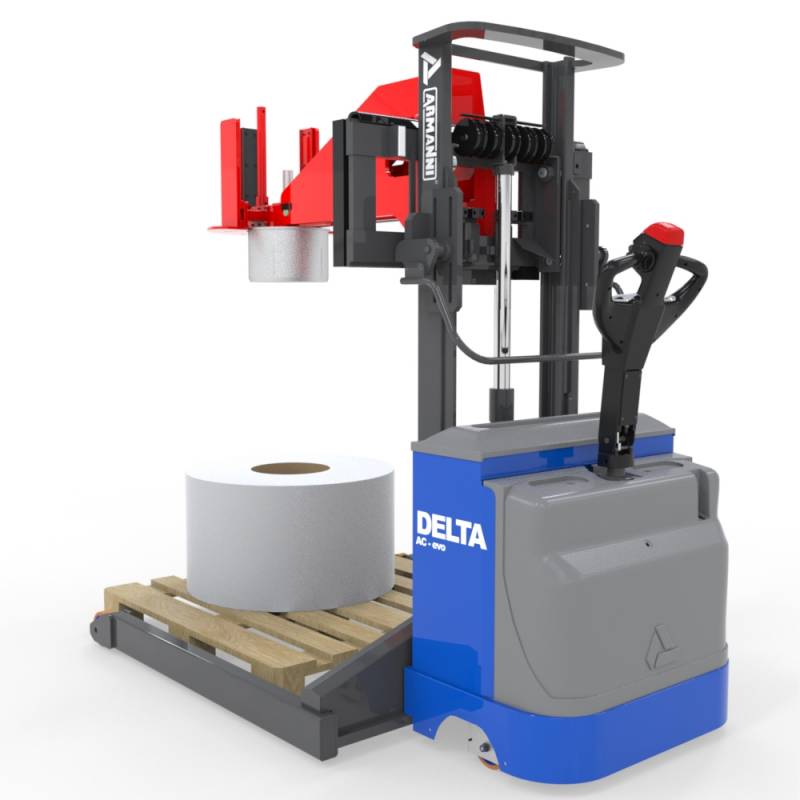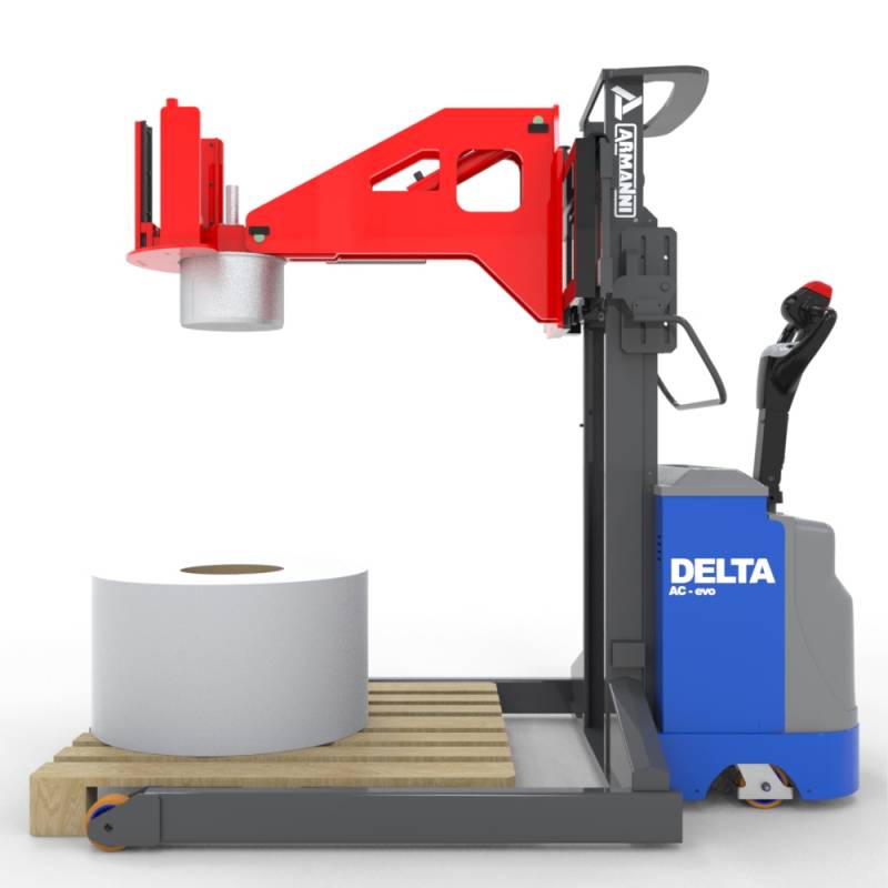 Delta E - MANDREL, ist ein extra starker Gabelstapler mit Manipulator für empfindliche Rollen, der für den intensiven Einsatz konzipiert ist. Er ist die ideale Lösung für diejenigen, die über mehrere Schichten hinweg empfindliche Rollen handhaben müssen, indem sie sie mit Hilfe eines internen Kerns handhaben. Die vergrößerten Klemmen, die außerhalb der Palette angebracht sind, ermöglichen es, die Rolle direkt von der Palette aufzunehmen oder freizugeben und erhöhen die Stabilität des Wagens während der Handhabung. Das System zum Aufnehmen der Rolle mittels eines automatisch einziehenden Manipulators gewährleistet jederzeit ein Höchstmaß an Sicherheit, da der Griff auch bei einer leeren Batterie oder einem zufälligen Stromausfall beibehalten wird. Der Delta E Mandrel wurde entwickelt, um Rollen zu greifen und um bis zu 90° zu drehen, um das Be- und Entladen von Verpackungsmaschinen zu erleichtern; er ist auf Anfrage auch mit einem automatischen Rollenschieber erhältlich, um die Rolle horizontal auf der Welle zu schieben.