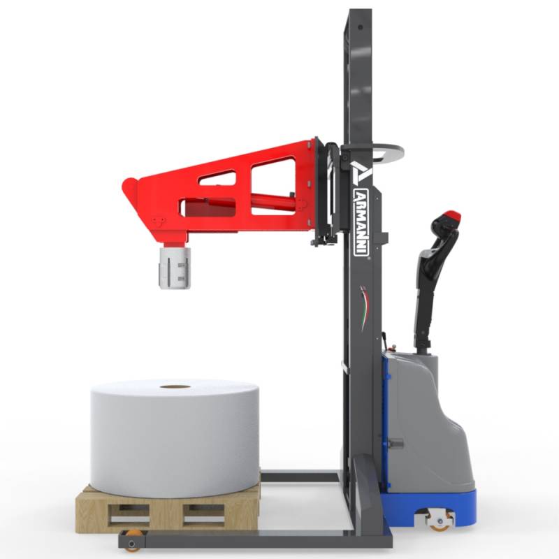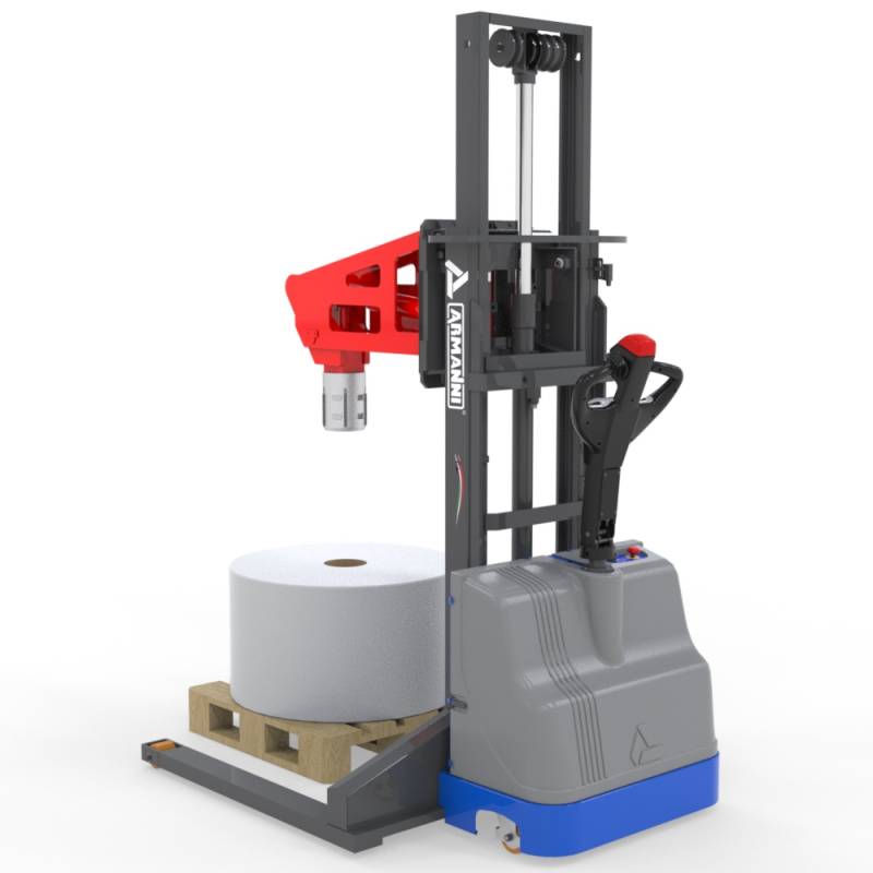 MASTER MANDREL, ist ein doppelsträngiger Masthubwagen mit Manipulator für empfindliche Spulen. Er ist die ideale Lösung für alle, die empfindliche Rollen durch einen inneren Kern manipulieren müssen. Die vergrößerten Klemmen, die außerhalb der Palette angebracht sind, ermöglichen es, die Rolle direkt von der Palette aufzunehmen oder zu lösen, und erhöhen die Stabilität des Staplers bei der Handhabung. Das Rollenaufnahmesystem mit automatischem Rückzugsmanipulator gewährleistet jederzeit ein Höchstmaß an Sicherheit, indem es den Griff auch bei leerer Batterie oder versehentlichem Stromausfall aufrechterhält. Master Mandrel wurde entwickelt, um Rollen zu greifen und um bis zu 90° zu drehen, um das Be- und Entladen von Verpackungsmaschinen zu erleichtern.