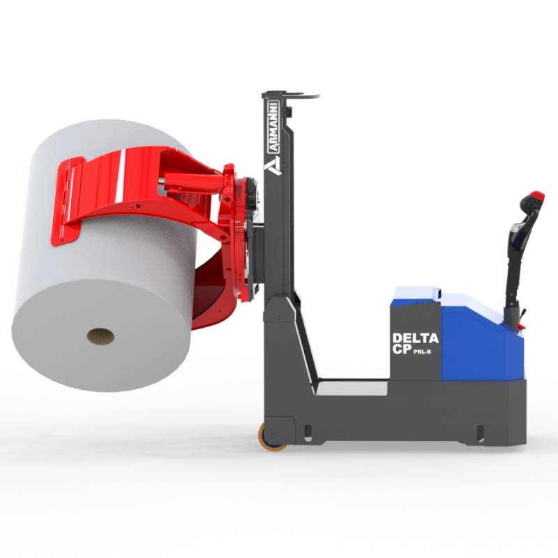 Der Delta CP PRL-B ist ein Wagen mit Gegengewicht, der mit einem Greifer zum Greifen und seitlichen Drehen von Rollen ausgestattet ist. Dank seiner Konfiguration ohne vordere Stützbeine ist er in der Lage, sich der auf einer Palette gelagerten Rolle aus jedem Winkel zu nähern, was die Gesamtabmessungen reduziert und die Arbeit in einem kleineren Arbeitsbereich ermöglicht. Die serienmäßige servogesteuerte Deichsellenkung bietet dem Bediener eine beispiellose Ergonomie und Benutzerfreundlichkeit. Der Greifer wird je nach Art der zu handhabenden Rollen und der auszuführenden Arbeit angepasst; er kann entweder mit klassischen Palettengreifern oder mit Greifern zum Greifen der Rolle direkt vom Boden aus konfiguriert werden.