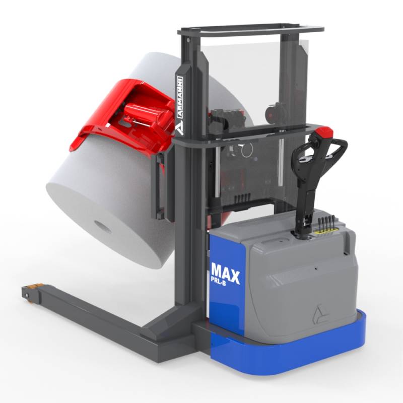 Max PRL-B ist der Gabelstapler der Armanni-Linie, der Robustheit und Kraft am besten zum Ausdruck bringt. Er wurde mit einer speziellen Struktur und besonderen Materialien entwickelt und gebaut und ermöglicht das sichere Greifen und Drehen von schweren Papier- und Plastikfolienrollen. In dieser Konfiguration ist der Max PRL-B mit vergrößerten Klammern ausgestattet, um Rollen bis zu 1200 kg direkt vom Boden aufnehmen zu können.