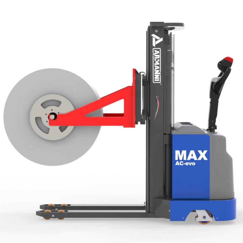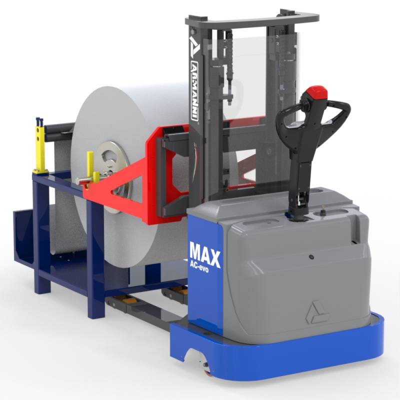 Der Max FS ist ein vollelektrischer Wagen mit speziellen V-förmigen (sattelförmigen) Gabeln, die zum Be- und Entladen von Maschinen Rollen an der Welle aufnehmen können. Der besonders stabile Rahmen, die hochwertigen Materialien und die Schnellwechselvorrichtung machen ihn ideal für jede Arbeitsumgebung, in der ein intensiver Mehrschichtbetrieb erforderlich ist. Die speziellen Sattelgabeln werden an die Breite der Welle und den Durchmesser der Rolle angepasst, wodurch Max FS zu einem maßgeschneiderten Produkt für die zu handhabende Last wird. Dies trägt zur Verbesserung der Effizienz, der Produktivität und der Sicherheit für die Bediener bei. Die hochwertige, vollständig in Italien gefertigte Konstruktion und die „Heavy Duty“-Struktur tragen dazu bei, dass Max FS ein Produkt ist, das eine ausgezeichnete Haltbarkeit garantiert.