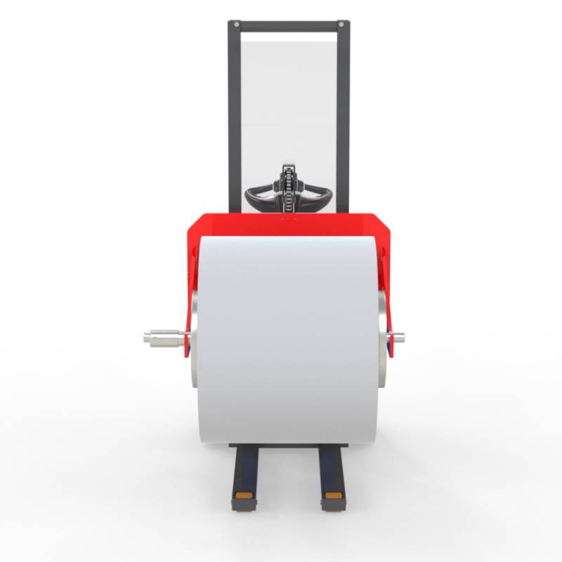 Dank der speziell angefertigten Sattelgabeln kann der Bediener die Rolle an der Welle anheben und direkt in die Abwickelmaschine einführen.