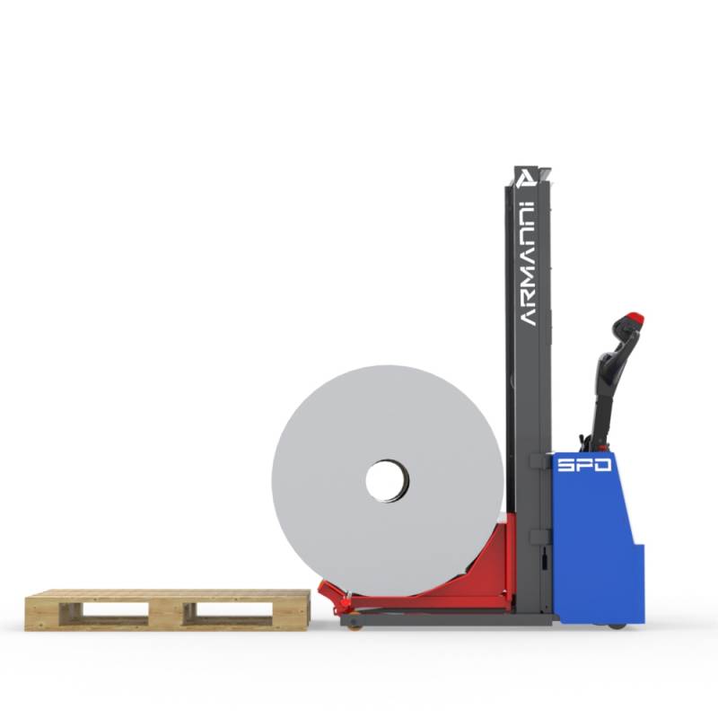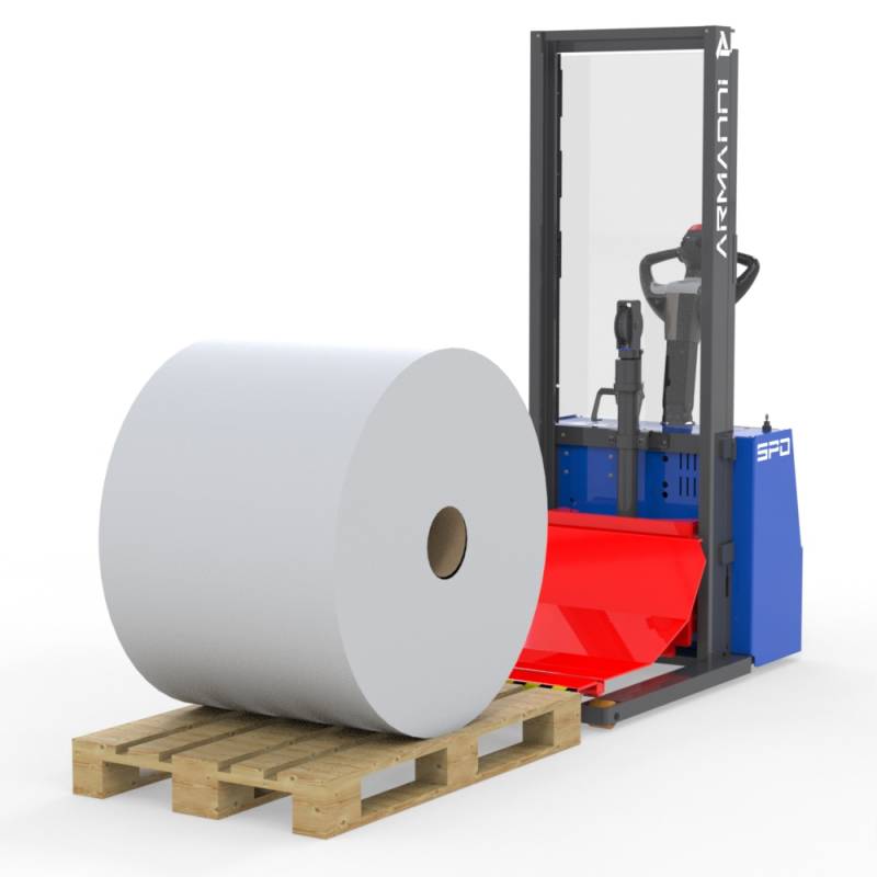 SPE CB ist ein vollelektrisches flurbasiertes Rollenhandlingsgerät mit hydraulische Wiege zum Lagern von Rollen mit einem Gewicht von bis zu 1200 kg.