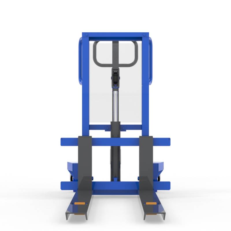 Système de levage des fourches au moyen d'une pompe manuelle rapide (montée à vide) avec levier de contrôle de la descente positionné sur celle-ci pour faciliter une exécution rapide ; grande facilité de manœuvre et de positionnement du chariot grâce au système de poignées latérales spécifiques.