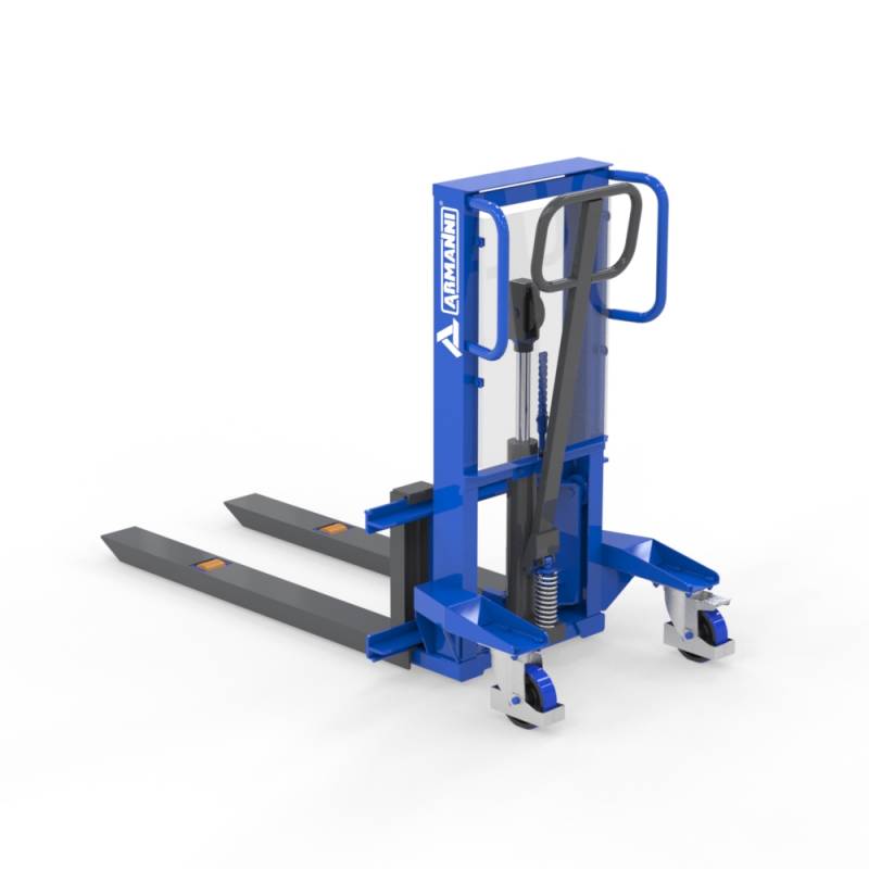 L'Alfa M 08 evo est un chariot élévateur à translation et élévation manuelles : les fourches sont soulevées au moyen d'une pompe manuelle à levée rapide, tandis que la descente est réglée par le levier situé sur le timon.