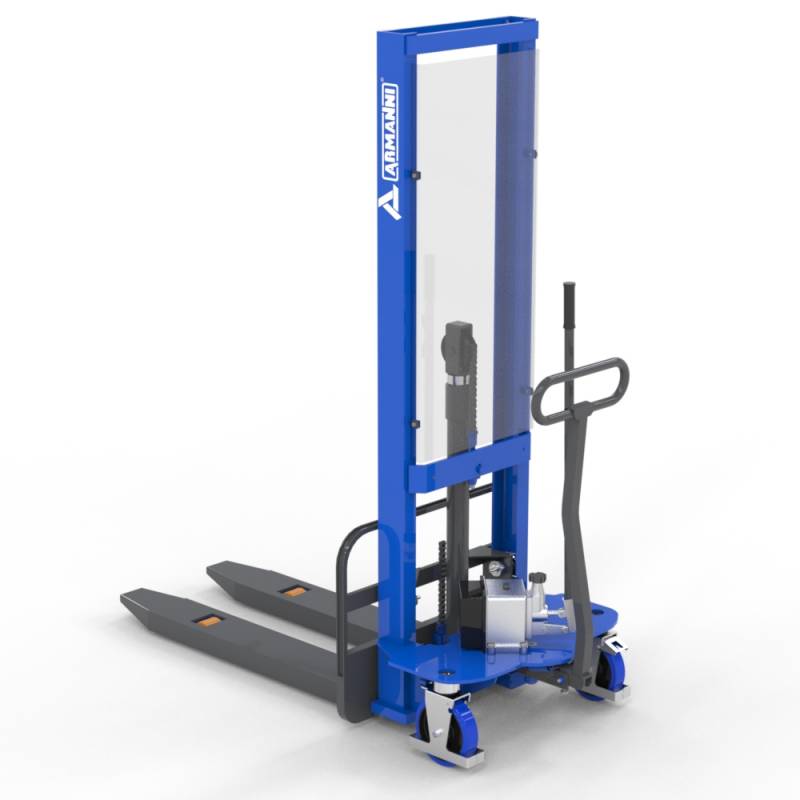 La robusta struttura e le forche fisse lunghe 1150 mm garantiscono significative portate offrendo in una versione completamente manuale una concreta alternativa ai modelli elettrici anche in caso di uso intensivo.