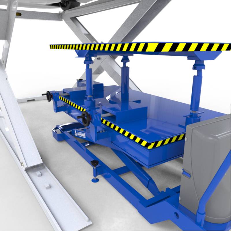 Questa tavola elevatrice speciale per il settore automotive è stata realizzata per soddisfare la grande richiesta del mercato di avere un prodotto robusto per l'installazione delle batterie nei veicoli elettrici. Risulta particolarmente utile sia alle aziende produttrici sia alle autofficine per la sostituzione dell'intera batteria da sotto al veicolo. Il sollevamento tramite pulsantiera consente di sollevare senza sforzo fino a 1200 Kg da qualsiasi posizione al di sotto del veicolo. Il pianale è dotato di regolazioni micrometriche tramite apposito volantino che consentono all'operatore di svolgere l'operazione di inserimento della batteria con il minimo sforzo. Le regolazioni micrometriche del pianale comprendono la traslazione del pianale avanti, indietro, destra e sinistra, mentre la regolazione yaw and pitch consente di inclinare il piano in qualsiasi direzione. Una comoda livella installata a bordo tavola consente all'operatore di agire sulle regolazioni micrometriche garantendo sempre una perfetta linearità del pianale anche in caso di pavimento non perfettamente livellato.